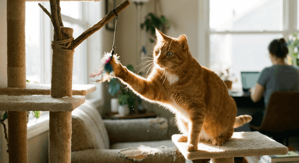 To reduce their total dependency on you as their sole source of entertainment, you need to make your home itself more engaging. To genuinely reduce a cat’s complete dependence on you for stimulation, you must optimize your space for independent enrichment — window perches, climbing shelves, and puzzle feeders give them meaningful activity that doesn’t require your participation. [See our complete guide to enriching your indoor cat’s environment here → The Small Apartment Cat Survival Guide: 7 Pillars of Indoor Enrichment]