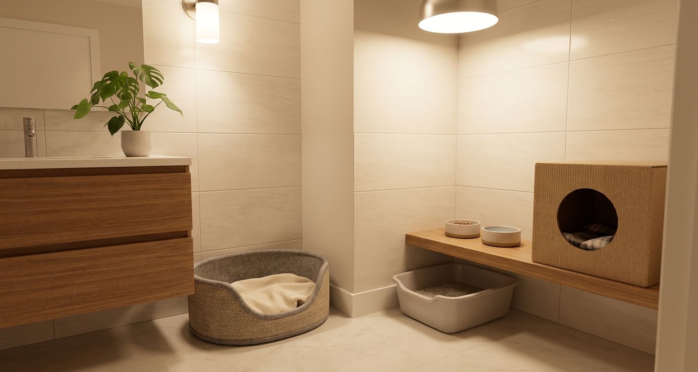 - A separate food bowl, water bowl, and litter box for the new cat — fully set up in the basecamp room before arrival