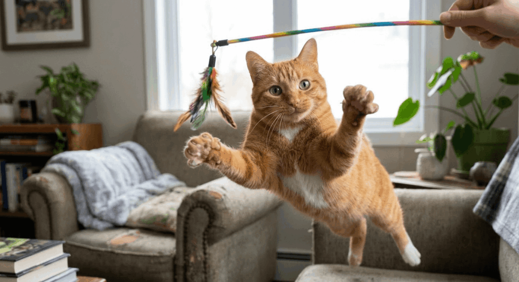 - Wand toy sessions (15 minutes, twice daily) that complete the full predatory sequence — stalk, chase, pounce, catch